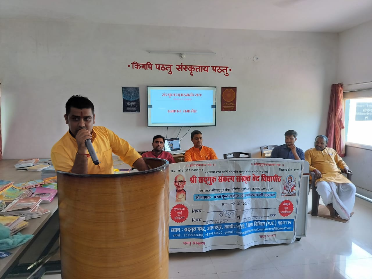 आनंदपुर विदिशा। संस्कृत सप्ताह के इतिदिवस में श्री सद्गुरु संकल्प वेद विद्या पीठ में समापन समारोह का आयोजन सभागार में मध्यान 1.00 बजे से प्रारंभ किया गया ।