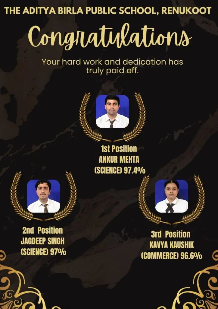 रेणुकूट(सोनभद्र)। हिंडाल्को इंडस्ट्रीज लि० रेणुकूट द्वारा संचालित आदित्य बिड़ला पब्लिक स्कूल, रेणुकूट (वर्ष 2024-2025) सी.बी.एस.सी बोर्ड कक्षा 12वीं का परीक्षा परिणाम शत-प्रतिशत रहा। विज्ञान संकाय के अंकुर मेहता ने 97.4 प्रतिशत अंक पाकर प्रथम स्थान, जगदीप सिंह (विज्ञान संकाय) 97 प्रतिशत अंक पाकर द्वितीय स्थान व काव्या कौशिक (वाणिज्य संकाय) 96.6 प्रतिशत अंक प्राप्त कर विद्यालय में तृतीय स्थान हासिल किया।