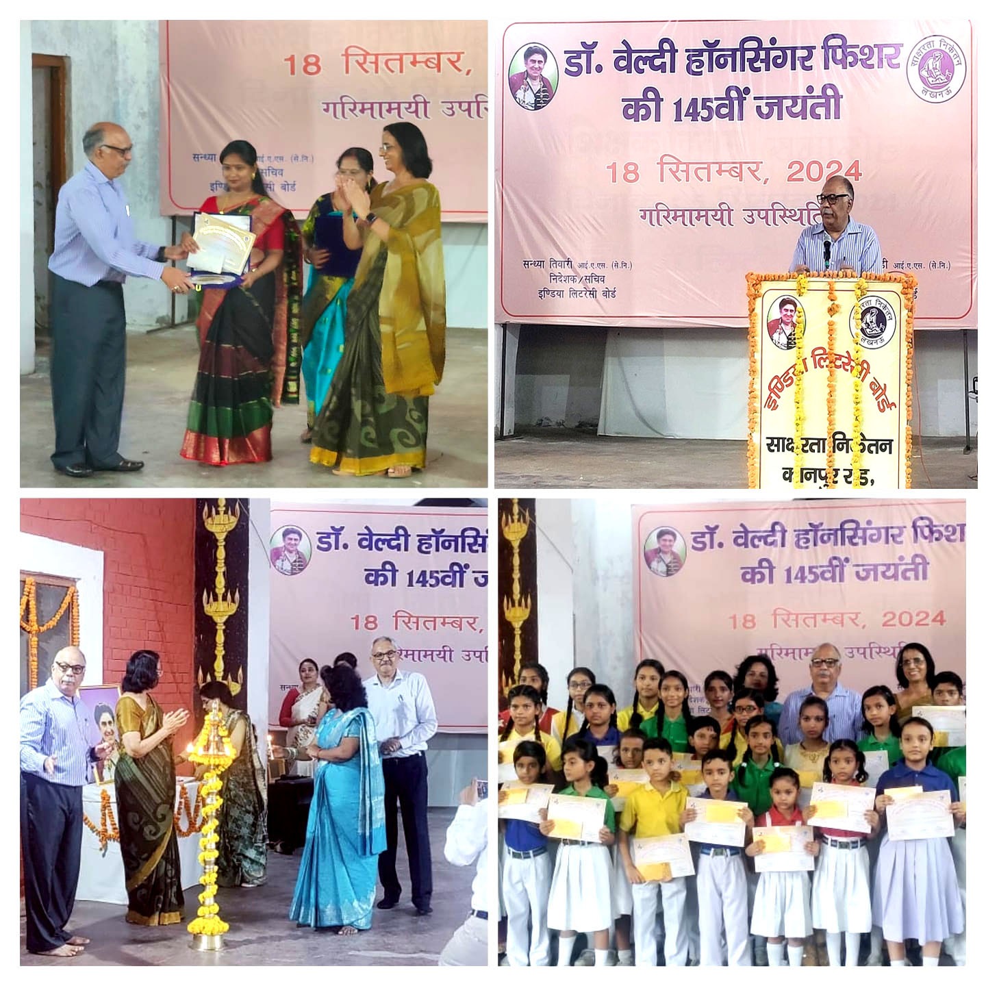 लखनऊ। इण्डिया लिटरेसी बोर्ड लखनऊ की संस्थापिका डाॅ. वेल्दी फिशर के 145 वें जयंती समारोह का आयोजन लखनऊ के कानपुर रोड स्थित साक्षरता निकेतन में दिनांक 18/09/2024 को किया गया। इस अवसर पर कार्यक्रम का शुभारम्भ सर्वधर्म प्रार्थना के साथ किया गया, जिसमें सभी धर्मों के लोग सम्मिलित हुए। डाॅ. वेल्दी फिशर के चित्र पर माल्यार्पण कर उन्हें याद किया गया। वहीं वेल्दी फिशर चिल्ड्रेन्स अकादमी के छात्र-छात्राओं द्वारा सांस्कृतिक कार्यक्रमों की प्रस्तुतियों ने मन मोह लिया।